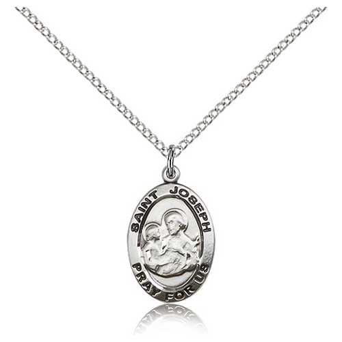 Die struck, hand-engraved St Joseph medal is made of sterling silver and has black antiqued letters. 18-inch sterling silver lite curb chain with lobster clasp. Inscription: SAINT JOSEPH PRAY FOR ME. Dimensions: 3/4in x 1/2in. This item is the size of a penny. Made in USA.