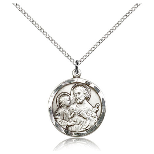 This ladies' round St Joseph medal necklace has no engraving and is made of sterling silver. 18-inch sterling silver lite curb chain with spring ring. Dimensions: 7/8in x 3/4in. This item is the size of a penny. Die struck, hand-engraved. Made in USA.