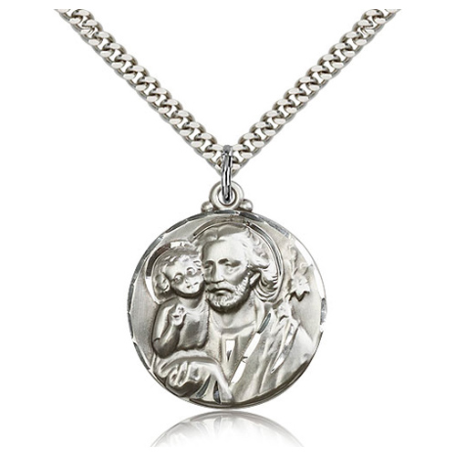 This round hand-engraved St Joseph medal is made of sterling silver. Dimensions: 1 1/8in x 7/8in. 24-inch stainless steel, endless heavy curb chain with silver plating. No inscription. This item is slightly larger than a quarter. Made in USA.