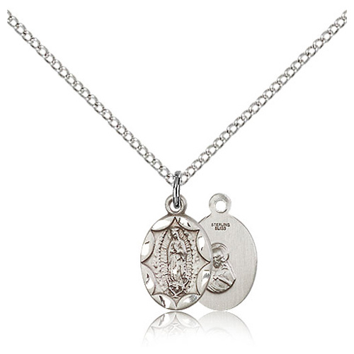 This petite Our Lady of Guadalupe charm is made of sterling silver. Dimensions: 1/2in x 1/4in. This item is half the height of a quarter. 18in sterling silver lite curb chain with lobster clasp. Plain back. Die struck, hand-engraved medal is made in USA.