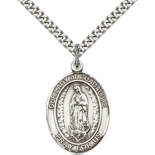 Die struck, hand-engraved Our Lady of Guadalupe medal. Inscription: OUR LADY OF GUADALUPE PRAY FOR US. 24-inch stainless steel, endless heavy curb chain with silver plating. Dimensions: 1in x 3/4in. This item is the size of a quarter. Made in USA.