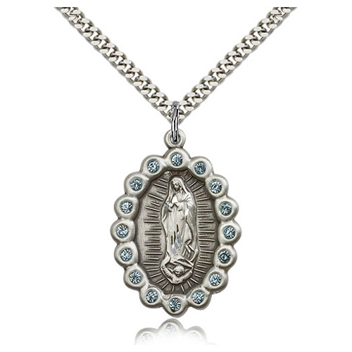 This large die struck, hand-engraved Our Lady of Guadalupe medal is adorned with aquamarine Swarovski crystals. Dimensions: 1 1/8in x 3/4in with jump ring. This item is slightly larger than a quarter. 24-inch stainless steel heavy curb chain with lobster clasp. Made in USA.
