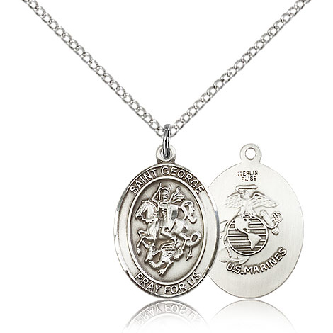 Die struck, hand-engraved Saint George medal. Free 18-inch sterling silver lite curb chain with lobster clasp. Reverse side depicts Marines insignia. Dimensions: 3/4in x 1/2in. This item is the size of a penny. Made in USA.