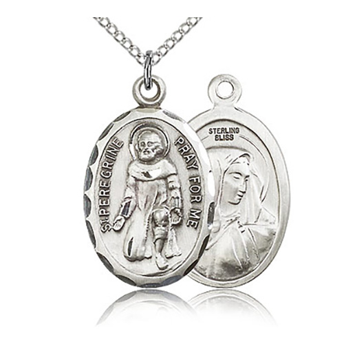 Die struck, hand-engraved St Peregrine medal. Inscription: ST PEREGRINE PRAY FOR ME. Free 18-inch sterling silver lite curb chain with lobster clasp. Plain back. Dimensions: 1in x 5/8in. This item is the size of a penny. Made in USA.