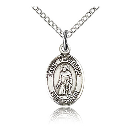 This very small sterling silver St Peregrine charm dangles from a sterling silver 18in lite curb chain with lobster clasp. Plain back. Dimensions: 1/2in x 1/4in. This item is half the height of a quarter. Made in USA.