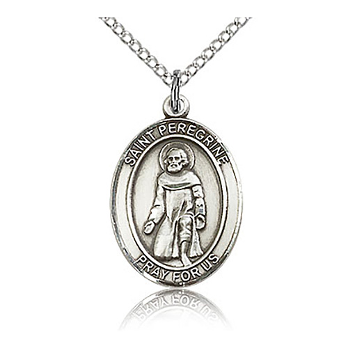 Die struck, hand-engraved St Peregrine medal is made of solid sterling silver. Inscription: SAINT PEREGRINE PRAY FOR US. 18-inch sterling silver lite curb chain has a lobster clasp. Plain back. Dimensions: 3/4in x 1/2in. This item is the size of a penny. Made in USA.