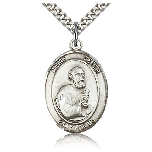 Sterling silver oval St Peter medal dangles from a 24-inch stainless steel, endless heavy curb chain with silver plating. Inscription: SAINT PETER PRAY FOR US. Dimensions: 1in x 3/4in. This item is the size of a quarter. Die struck, hand-engraved. Made in USA.