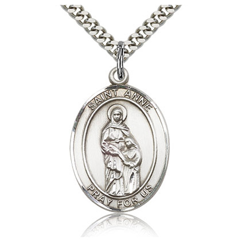 Sterling silver oval St Anne medal dangles from a 24-inch stainless steel, endless heavy curb chain with silver plating. Dimensions: 1in x 3/4in. This item is the size of a quarter. Inscription: SAINT ANNE PRAY FOR US. Die struck, hand-engraved. Made in USA.