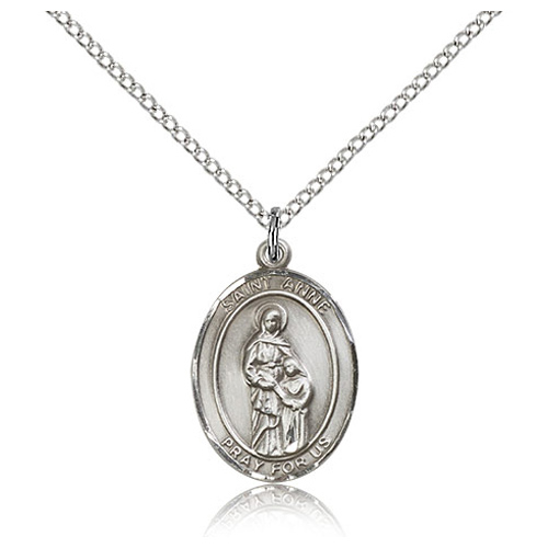 Sterling silver oval St Anne medal dangles from a sterling silver 18-inch lite curb chain with lobster clasp. Plain back. Dimensions: 3/4in x 1/2in. This item is the size of a penny. Inscription: SAINT ANNE PRAY FOR US. Die struck, hand-engraved. Made in USA.