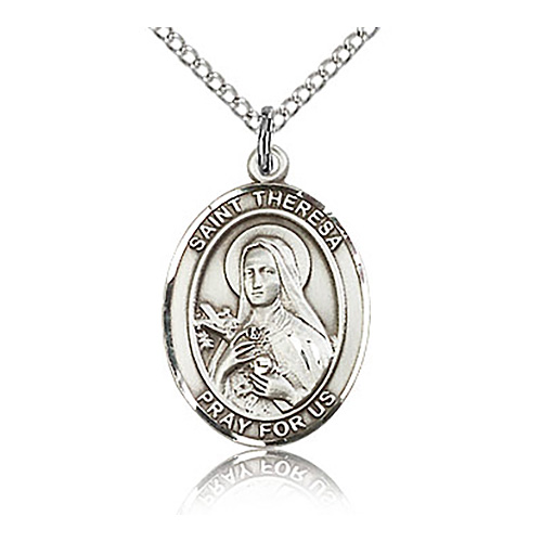Die struck, hand-engraved St Theresa medal. Free 18-inch sterling silver lite curb chain with lobster clasp. Dimensions: 3/4in x 1/2in. This item is the size of a penny. Made in USA.
