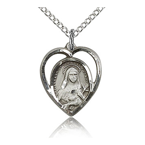 This small heart-shaped sterling silver St Theresa medal dangles from a sterling silver 18-inch lite curb chain with lobster clasp. Dimensions: 5/8in x 1/2in. This item is slightly smaller than a dime. Die struck, hand-engraved. Made in USA.