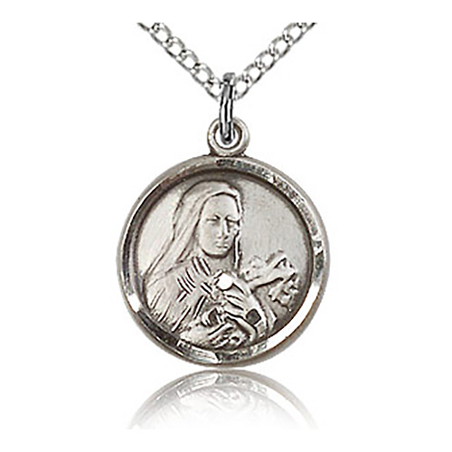 This small round St Theresa medal is made of sterling silver. It dangles from a sterling silver 18 inch curb chain with lobster clasp. Dimensions: 5/8in x 1/2in with jump ring. This item is half the size of a quarter. Die struck, hand-engraved. Made in USA.