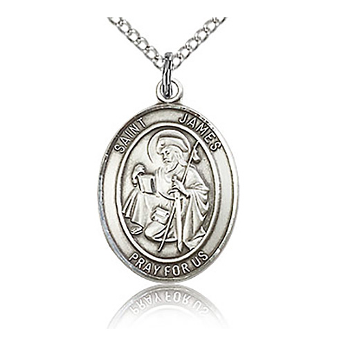 This 3/4in oval St James the Greater medal is made of sterling silver. 18-inch sterling silver lite curb chain with lobster clasp. Die struck, hand-engraved. Dimensions: 3/4in x 1/2in. This item is the size of a penny. Made in USA.