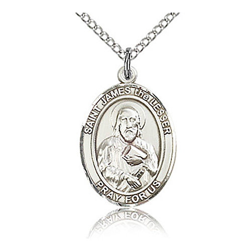 Die struck, hand-engraved St James the Lesser medal. Free 18-inch sterling silver lite curb chain with lobster clasp. Dimensions: 3/4in x 1/2in. This item is the size of a penny. Made in USA.