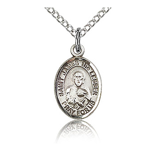 Die struck, hand-engraved St James the Lesser charm. Free 18-inch sterling silver lite curb chain with lobster clasp. Plain back. Dimensions: 1/2in x 1/4in. This item is half the height of a quarter. Made in USA.