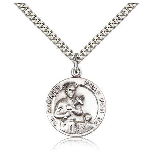 Die struck, hand-engraved St Gerard medal. Inscription: ST. GERARD PRAY FOR US. Free 24-inch stainless steel, endless heavy curb chain with silver plating. Dimensions: 7/8in x 3/4in. This item is the size of a nickel. Made in USA.