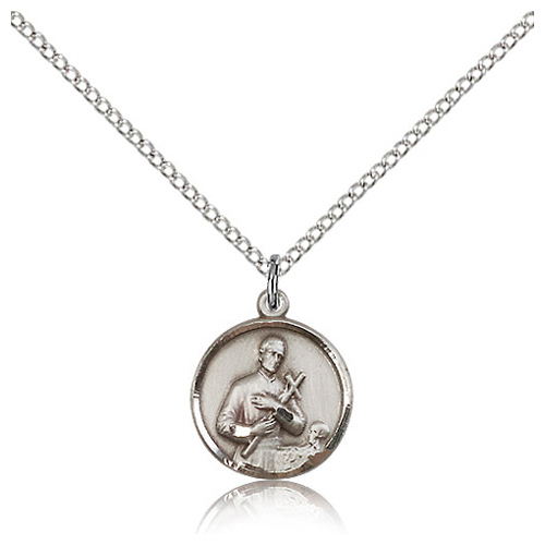 Die struck, hand-engraved St Gerard medal. Free 18-inch sterling silver lite curb chain with lobster clasp. Dimensions: 5/8in x 1/2in with jump ring. This item is half the size of a quarter. Made in USA.