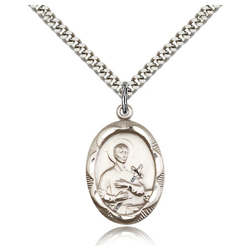 Die struck, hand-engraved St Gerard medal is made of sterling silver. 24-inch stainless steel, endless heavy curb chain with silver plating. Dimensions: 1in x 5/8in. This item is the size of a quarter. Made in USA.