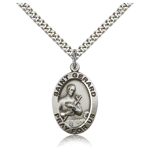 This oval St Gerard medal is made of polished sterling silver and has black antiqued lettering. Inscription: SAINT GERARD PRAY FOR US. 24-inch stainless steel, endless heavy curb chain with silver plating. Dimensions: 1in x 5/8in. This item is the size of a quarter. Die struck, hand-engraved Made in USA.