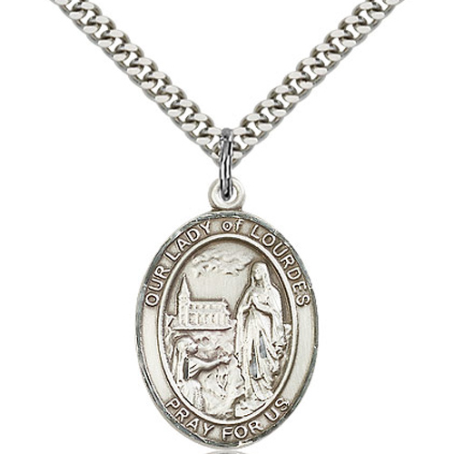 Die struck, hand-engraved Our Lady of Lourdes medal is made of sterling silver. Inscription: OUR LADY OF LOURDES PRAY FOR US. 24-inch stainless steel, endless heavy curb chain with silver plating. Dimensions: 1in x 3/4in. This item is the size of a quarter. Made in USA.