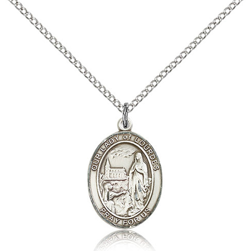 Die struck, hand-engraved oval Our Lady of Lourdes medal is made of sterling silver. 18-inch sterling silver lite curb chain with lobster clasp. Dimensions: 3/4in x 1/2in. This item is the size of a penny. Made in USA.