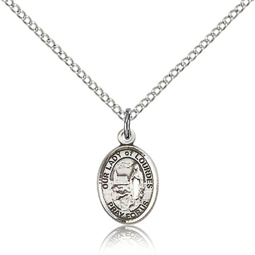 This very small Our Lady of Lourdes charm is made of sterling silver. 18-inch sterling silver lite curb chain with lobster clasp. Plain back. Dimensions: 1/2in x 1/4in. This item is half the size of a quarter. Die struck, hand-engraved. Made in USA.