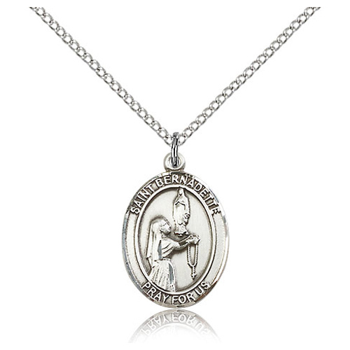 Die struck, hand-engraved St Bernadette medal. Free 18-inch sterling silver lite curb chain with lobster clasp. Dimensions: 3/4in x 1/2in. This item is the size of a penny. Made in USA.