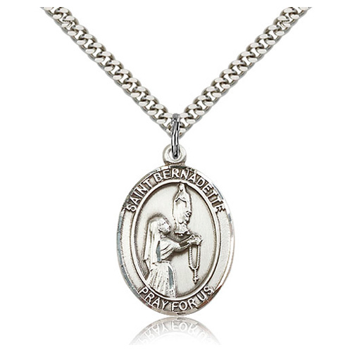 Die struck, hand-engraved St Bernadette medal dangles from a 24-inch stainless steel, endless heavy curb chain with silver plating. Inscription: SAINT BERNADETTE PRAY FOR US. Dimensions: 1in x 3/4in. This item is the size of a quarter. Made in USA.