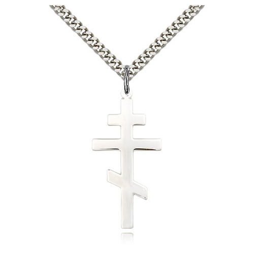 Die struck St Andrew cross is made of solid, polished sterling silver. Dimensions: 1 3/8in x 5/8in. 24-inch stainless steel, endless heavy curb chain with silver plating. This item is larger than a quarter. Made in USA.