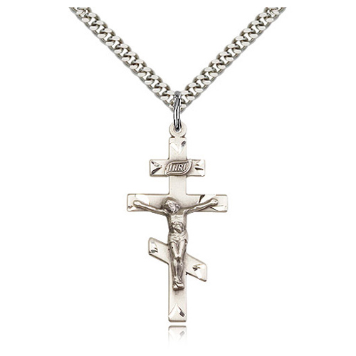This men's St Andrew crucifix pendant is made of solid, polished sterling silver. 24-inch stainless steel, endless heavy curb chain with silver plating. Dimensions: 1 3/8in x 5/8in. This item is larger than a quarter. Made in USA.