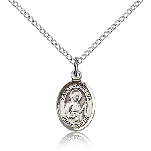 This very small sterling silver St Camillus charm dangles from a sterling silver 18-inch curb chain with lobster clasp. Plain back. Dimensions: 1/2in x 1/4in. This item is half the height of a quarter. Made in USA.