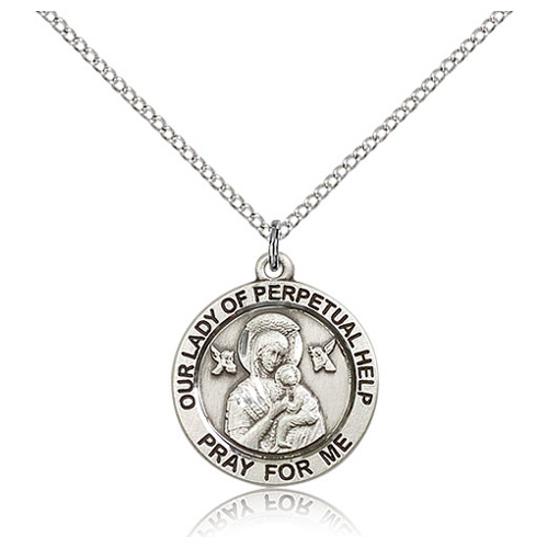 This round lady of perpetual help medal is made of sterling silver. Sterling silver 18-inch lite curb chain with lobster clasp. Dimensions: 3/4in x 3/4in. This item is the size of a penny. Die struck, hand-engraved medal. Made in USA.