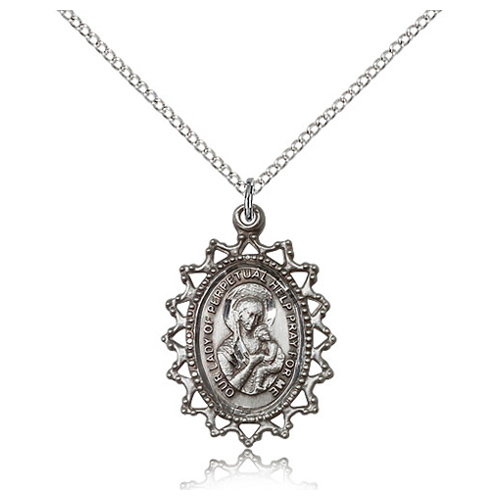Die struck, hand-engraved medal. Inscription: OUR LADY OF PERPETUAL HELP PRAY FOR ME. Free 18-inch sterling silver lite curb chain with lobster clasp. Dimensions: 1in x 3/4in. This item is the size of a quarter. Made in USA.