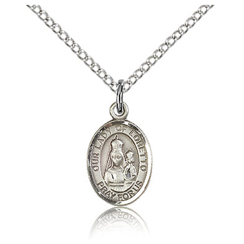 This very small sterling silver lady of Loretto charm dangles from a sterling silver 18in lite curb chain with lobster clasp. Plain back. Dimensions: 1/2in x 1/4in. This item is half the height of a quarter. Made in USA.