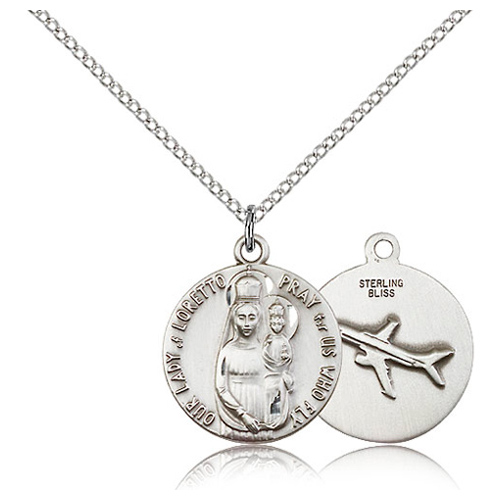 Die struck, hand-engraved round Our Lady of Loreto medal is made of sterling silver. Dimensions: 3/4in x 7/8in. Inscription: OUR LADY OF LORETTO PRAY FOR US WHO FLY. Reverse side depicts an airplane. 18-inch sterling silver lite curb chain with lobster clasp. This item is the size of a penny. Made in USA.