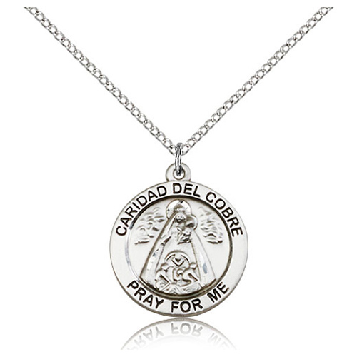 Die struck, hand-engraved round Caridad del Cobre medal is made of sterling silver. Inscription: CARIDAD DEL COBRE PRAY FOR ME. 18-inch sterling silver lite curb chain with lobster clasp. Plain back. Dimensions: 3/4in x 3/4in. This item is the size of a penny. Made in USA.