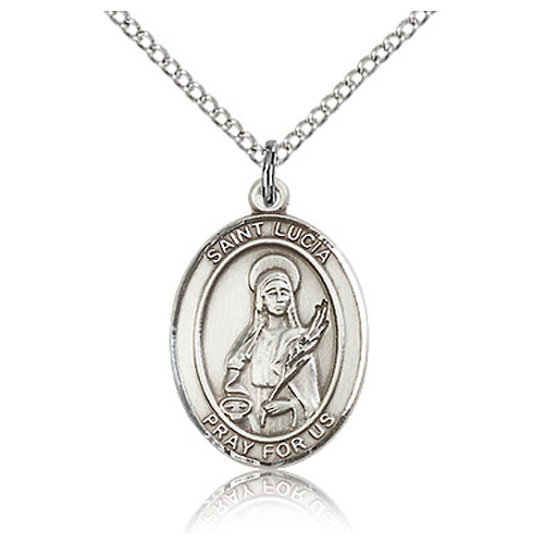 Die struck, hand-engraved oval Saint Lucia medal is made of polished sterling silver. 18-inch sterling silver lite curb chain with lobster clasp. Dimensions: 3/4in x 1/2in. This item is the size of a penny. Made in USA.