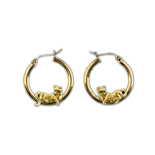 These solid 14k yellow gold cat lounge hoop earrings have genuine emerald eyes. Designed by animal sculptor Jack Slack. Approximate weight: 3.2 grams. Handmade in the U.S.A.
