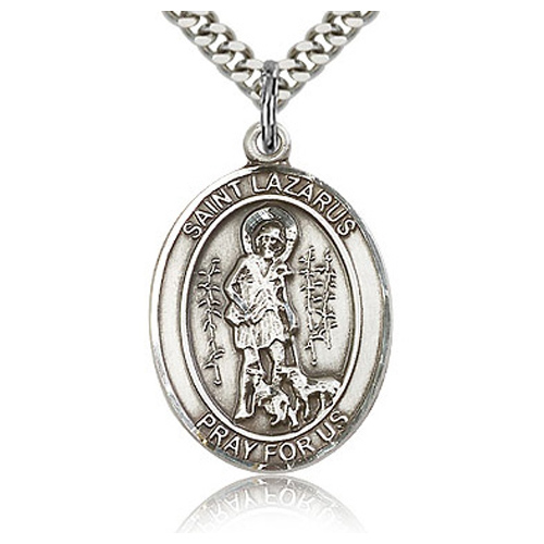 Die struck, hand-engraved Saint Lazarus medal is made of solid sterling silver. Inscription: SAINT LAZARUS PRAY FOR US. 24-inch stainless steel, endless heavy curb chain with silver plating. Dimensions: 1in x 3/4in. This item is the size of a quarter. Made in USA.