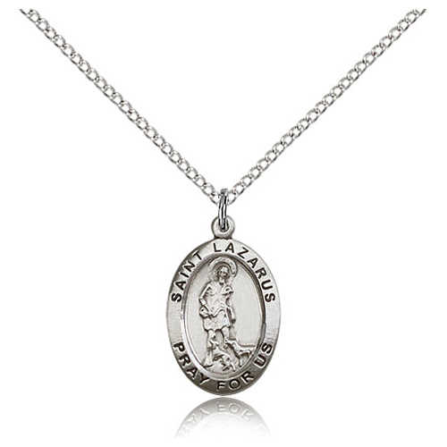 Die struck, hand-engraved Saint Lazarus medal. Inscription: SAINT LAZARUS PRAY FOR US. Free 18-inch sterling silver lite curb chain with lobster clasp. Dimensions: 3/4in x 1/2in. This item is the size of a penny. Made in USA.