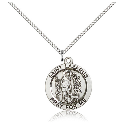 This ladies' round Saint Lazarus medal is made of sterling silver. Inscription: SAINT LAZARUS PRAY FOR ME. 18-inch sterling silver lite curb chain has a lobster clasp. Plain back. Dimensions: 3/4in x 3/4in. This item is the size of a penny. Die struck, hand-engraved. Made in USA.