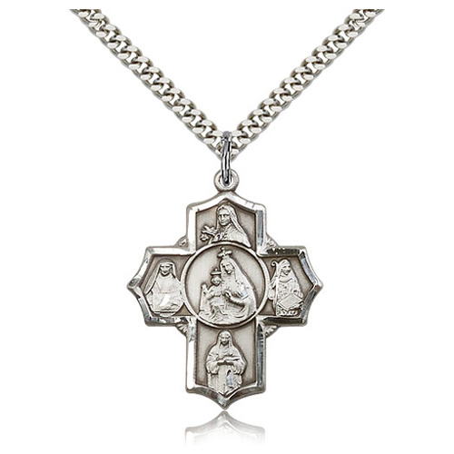 Die struck, hand-engraved Lady of Mount Carmel four-way medal. Free 24-inch stainless steel, endless heavy curb chain with silver plating. Dimensions: 1 1/4in x 1in. This item is larger than a quarter. Made in USA.