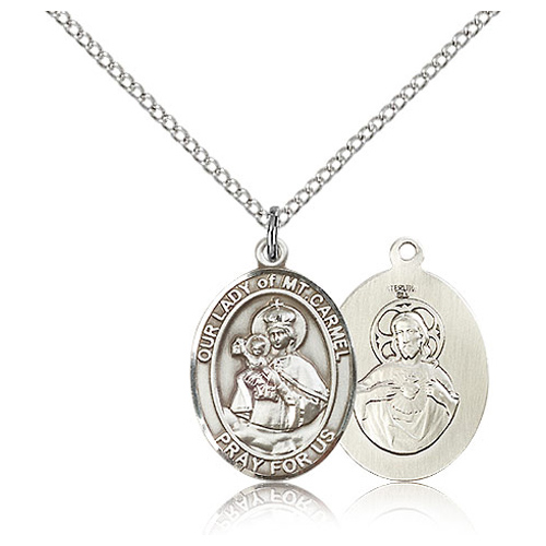 Die struck, hand-engraved Our Lady of Mount Carmel medal. 18-inch sterling silver lite curb chain with lobster clasp. Dimensions: 3/4in x 1/2in. This item is the size of a penny. Made in USA.