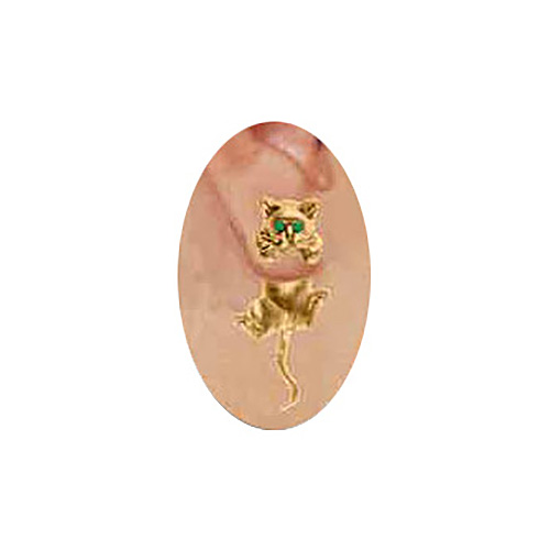 These solid 14k yellow gold cat through earrings are not flat. They are dimensionally sculptural. Features genuine emerald eyes. Designed by animal sculptor Jack Slack. Approximate weight: 6.9 grams. Handmade in the USA.