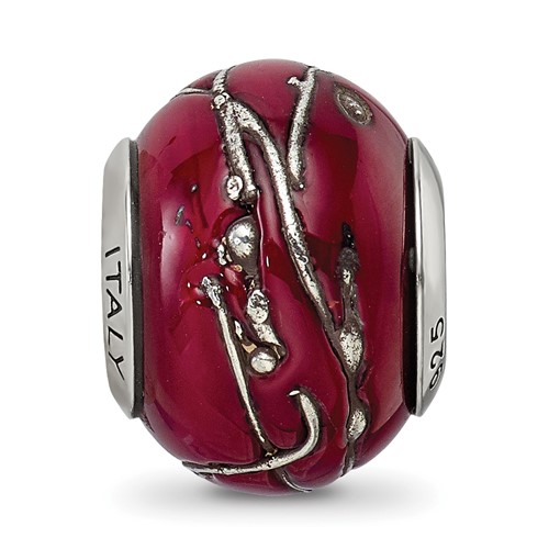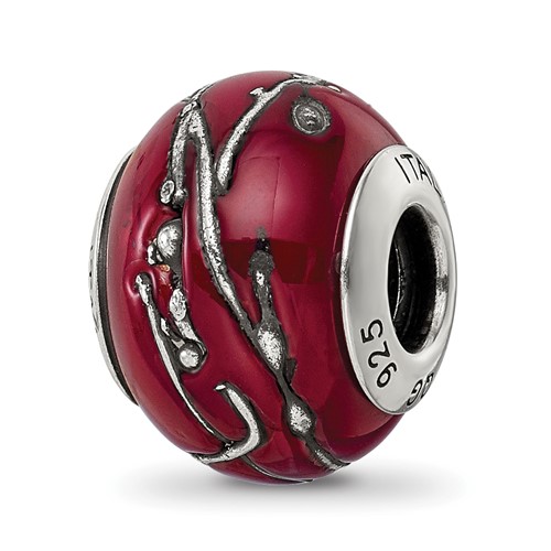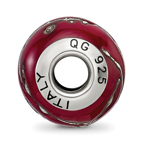 This round red Murano glass bead has silver stripes and is made of antiqued sterling silver. This Reflections bead fits all major modular bracelet brands. Item size: 12.7mm x 10.0mm. Made in Italy.