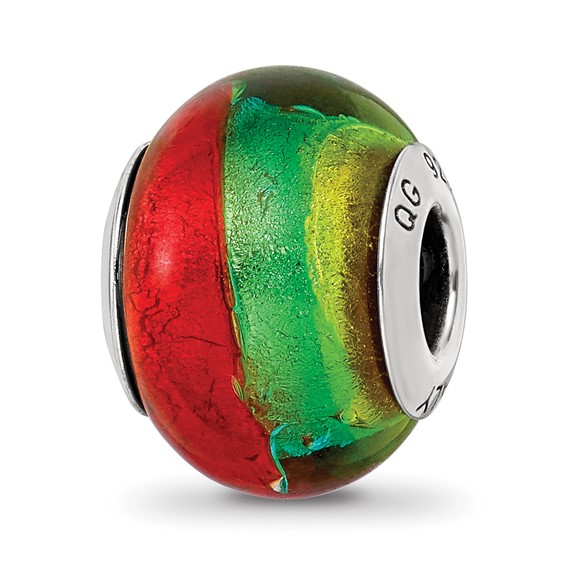 Red, green and yellow Murano glass bead is made of antiqued, solid sterling silver. Bead dimensions: approximately 13.25mm diameter, bead hole: 4.00mm diameter. Imported.