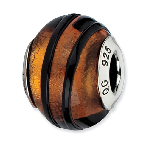 This round orange Murano glass bead has black stripes. Made of antiqued sterling silver. This Reflections bead fits all major modular bracelet brands. Item size: 12.7mm x 10.0mm. Made in Italy.