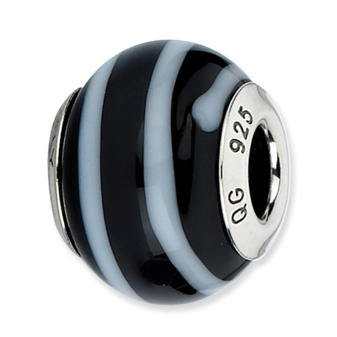 Murano glass bead is black with white stripes. Made of antiqued, solid sterling silver. Bead dimensions: approximately 13.25mm diameter, bead hole: 4.00mm diameter. Imported.