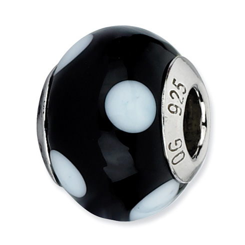 This round black Murano glass bead has white dots and is made of antiqued sterling silver. Bead size: 12.7mm x 10mm. This Reflections bead fits all major modular bracelet brands. Made in Italy.