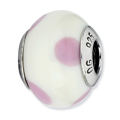 This round cream Murano glass bead has light purple dots and is made of antiqued sterling silver. Bead size: 12.7mm x 10mm. This Reflections bead fits all major modular bracelet brands. Made in Italy.